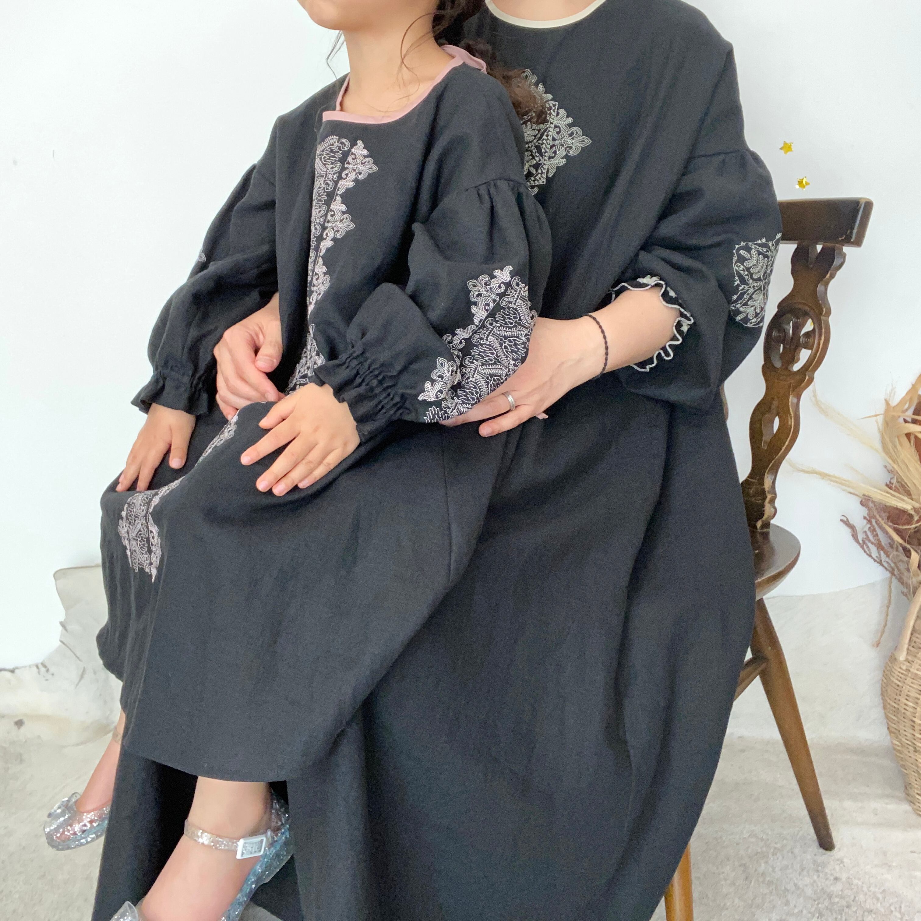 [ Kids ] ソロチカ刺繍のリネンギャザーワンピース -black-