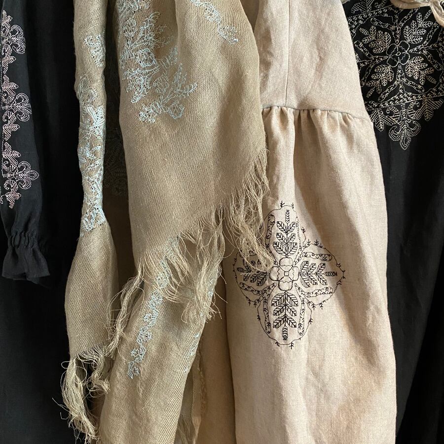 身頃に施された刺繍は、ウクライナの女性がお守りとして身にまとう伝統衣装の [ ソロチカ ] を参考に、サテンやタタミステッチなど面を埋める技法は使わず、鉛筆で線を描くような細やかなステッチで表現しています。